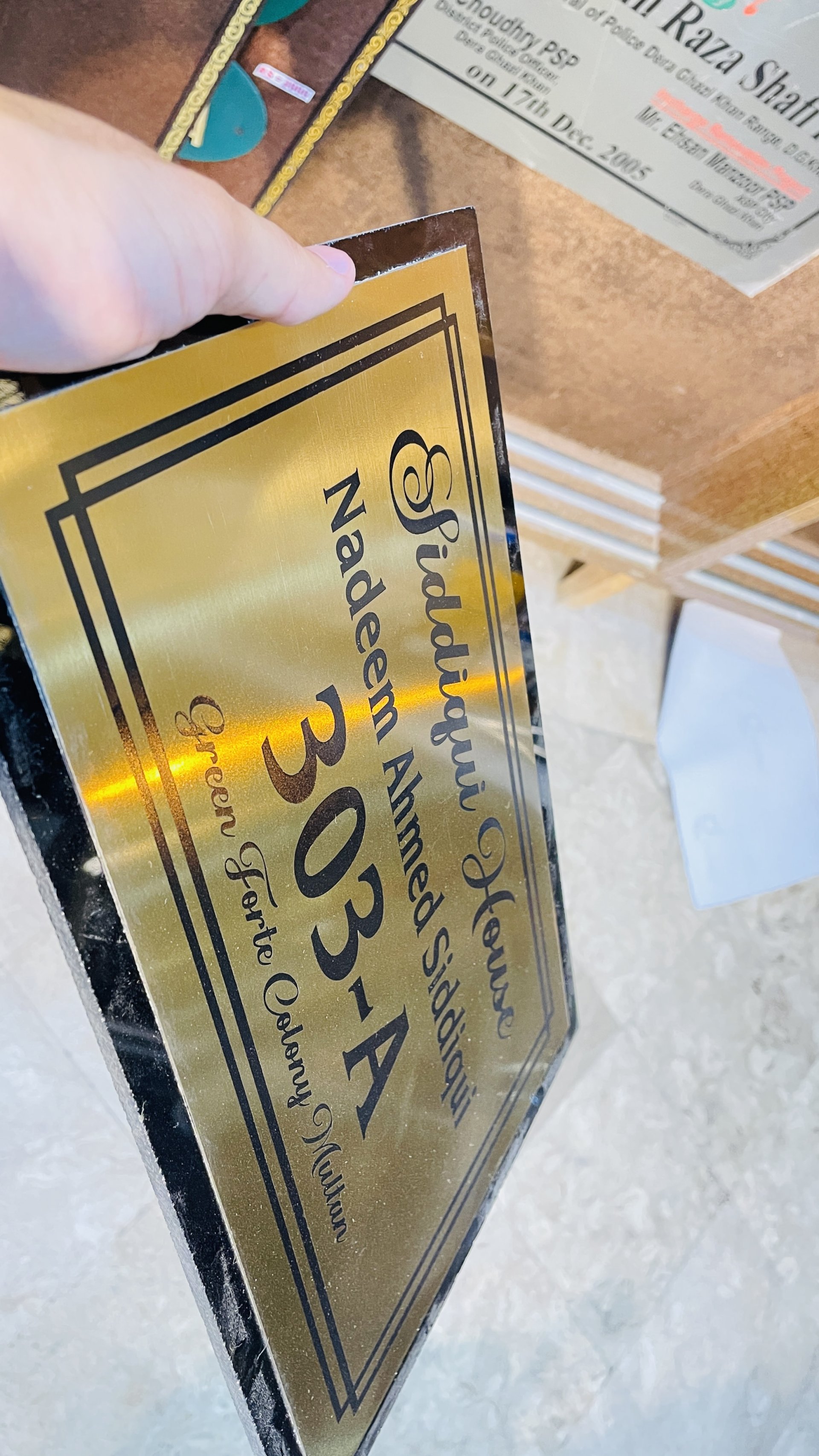 Introduce timeless elegance to your home with our Golden Steel Engraving Customise House Name Plate from Lucky Arts. Expertly crafted with high-quality golden stainless steel engraving and a 5mm black acrylic base, this name plate offers a perfect blend of durability and sophistication. Personalize it to make a distinctive statement at your entrance, reflecting your unique style and taste.