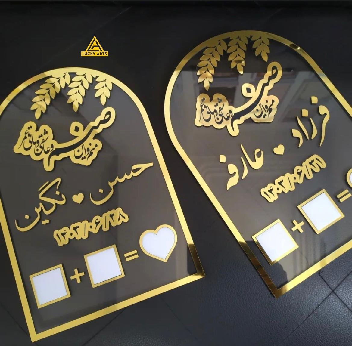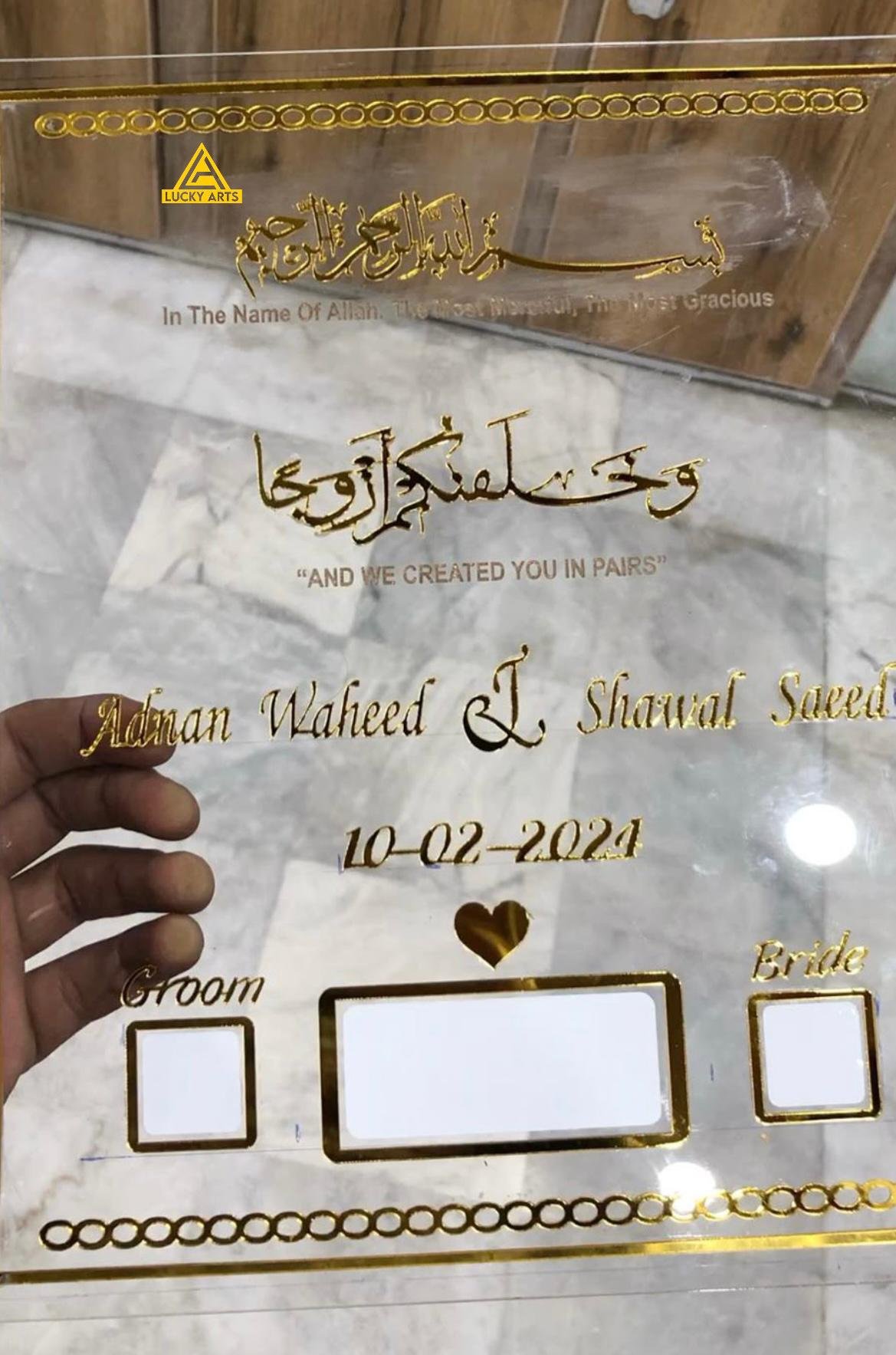 Features Arabic calligraphy such as Bismillah, Ayat from the Quran, or Dua for marriage.