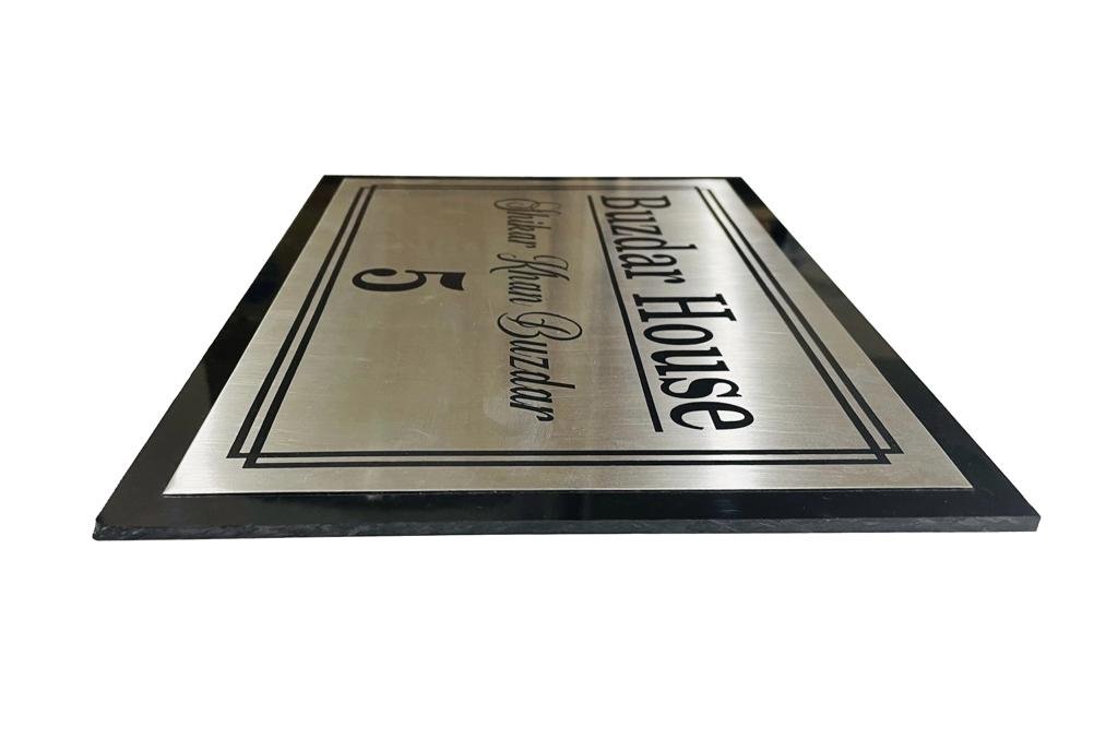 Introduce timeless elegance to your home with our Silver Steel Engraving Customise House Name Plate from Lucky Arts. Expertly crafted with high-quality silver stainless steel engraving and a 5mm black acrylic base, this name plate offers a perfect blend of durability and sophistication. Personalize it to make a distinctive statement at your entrance, reflecting your unique style and taste.